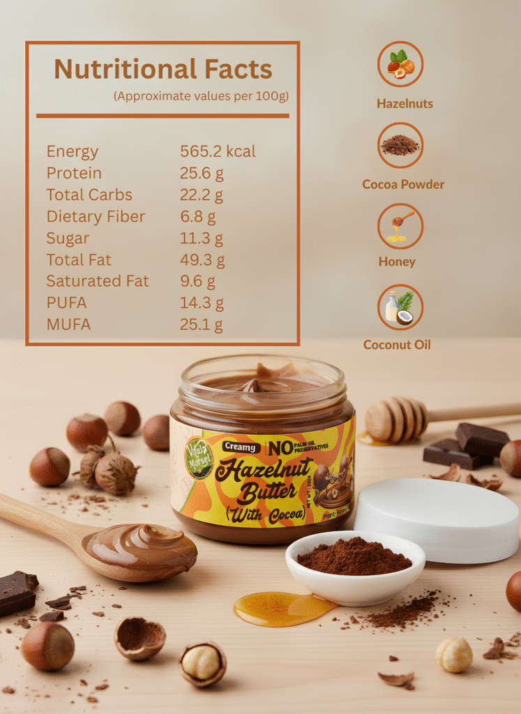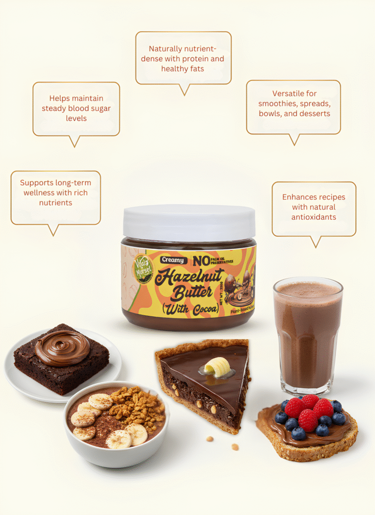 Fuel your body and delight your taste buds with Vital Morsel Hazelnut Butter with Cocoa — a luxurious spread designed for those who value purity and taste equally.